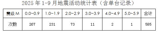 2025年1-9月地震活动统计表及多台定位震中分布图如下所示: